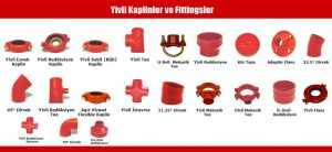 Yangın tesisatları : Yivlli boru ve fittingslerinin kullanıldığı yerlerden en bilineni olmakla beraber sadece bir tanesidir.Yivli boru bağlantıları kaynaklı imalatın yapılmasının mümkün olmadığı yerlerde kullanılabileceği gibi, diğer bağlantı türlerine göre işçilik süresi daha kısadır. Borulamann şartlarının zor olduğu alanlarda boru güzergâhında esneklik sağlar. Boru parçalarının kolaylıkla sökülüp takılmasına olanak sağlayan bağlantı türü olduğundan tesisatta gerekli görülen noktalarda ve tesisatın depremden korunmasına yönelik uygulamalarda, kısmi olarak da kullanılmaktadır. Borulara yiv açılarak üzerinde contaları bulunan kaplinler vasıtasıyla birleştirilir. Borulara yiv açma işlemi, ezme veya kesme metodu ile yapılır. Kesme metodu ile yiv açma işlemi özel yiv makinesi veya tornada yapılır. Kesme metodu genellikle, orta ve ağır seri borularda yüksek çaplarda tercih edilir. Borunun et kalınlılığının %50’sinin altında bir metal parça borudan kesilir. Kesme derinliği; yivli ekipman üreticisi tarafından verilen boru et kalınlığı değerlerine göre belirlenmelidir. Ezme metodu ile yiv açma işleminde özel yiv açma aletleri kullanılır. Ezme metodu, çeşitli et kalınlıklarında ve büyük çaplarda uygulanabilmektedir. Ezme metodunda boru ezilerek, yiv açılır. Yiv ölçüleri, boru ucuna mesafe ve yiv derinliği üretici tarafından verilen boru et kalınlığı değerlerine göre belirlenmelidir. Yiv üzerine kaplin contası yerleştirildikten sonra kaplin üzerindeki vidalarla sabitleştirilir. Vidalar sabitleştirilirken uygun torklarda sıkılmalıdır. Kaplinlerin contalarının tipi ve sıcaklık derecesi, spesifik uygulamalarda ortam koşullarına uygun olarak seçilmelidir.Borudan branşman alınan noktalarda, çıkış ağızlı yivli bağlantı elemanları kullanılabilir. Kullanılan çıkış ağızlı yivli bağlantı elemanının çıkış ağzındaki conta için üretici tarafından verilen delik ölçüsünde delik açılır. Çıkış ağızlı yivli bağlantı elemanları boru bağlantısı görevi görmez. Bağlantı elemanın çıkış ağzı tesisatın devamında kullanılacak dişli veya yivli boru bağlantı türüne uygun olarak seçilmelidir.